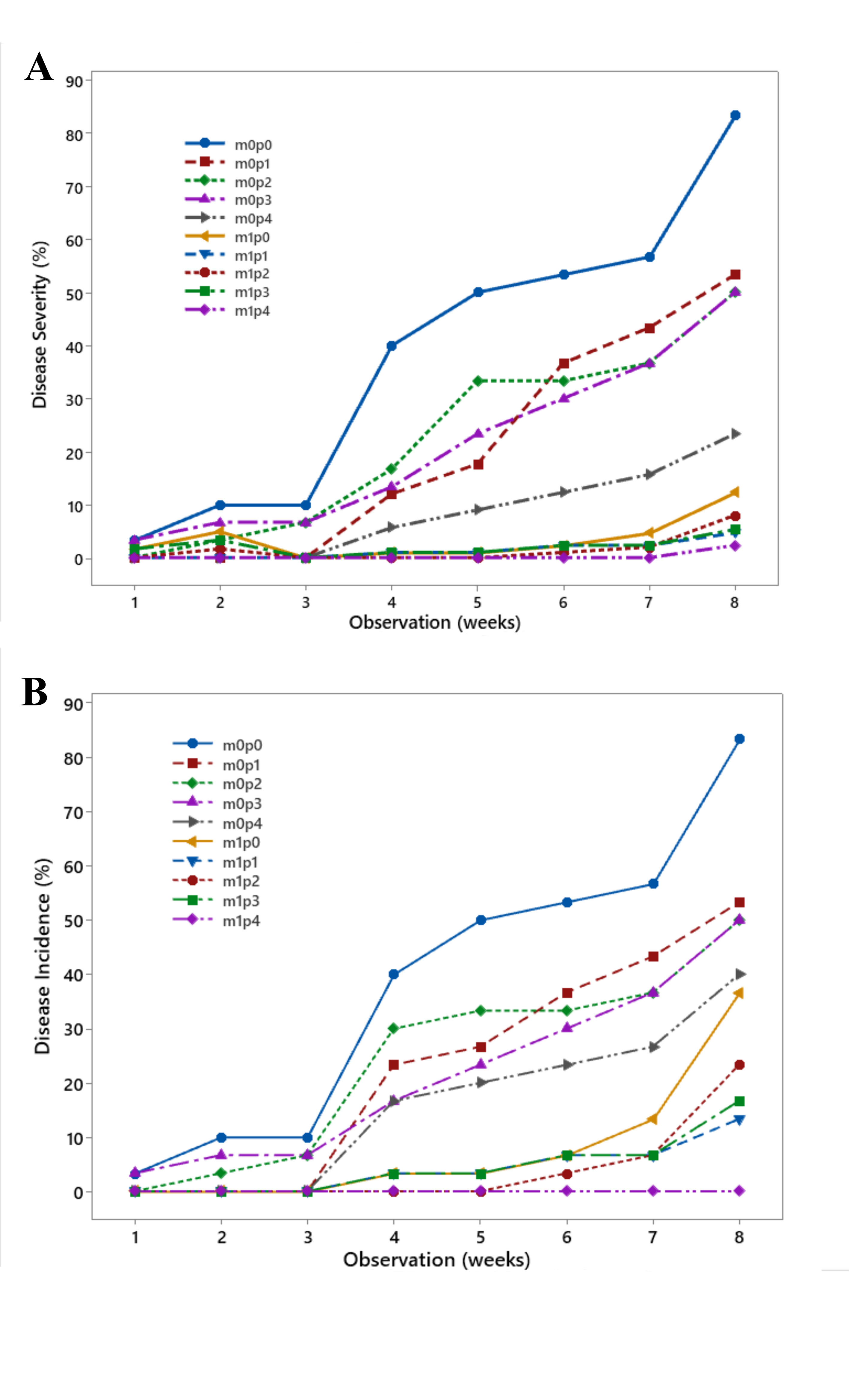 Disease progression of P. capsici infection on black pepper seedlings treated with AMF (m) and KP fertilizer (p). (A) Disease Severity (%); and (B) Disease Incidence (%). m = AMF application (0 = no, 1 = given); p = dosage of KP fertilizer application in each polybag (0 = no fertlizer, 1 = 1.5 g, 2 = 2.5 g, 3 = 3.5 g, 4 = 5 g).