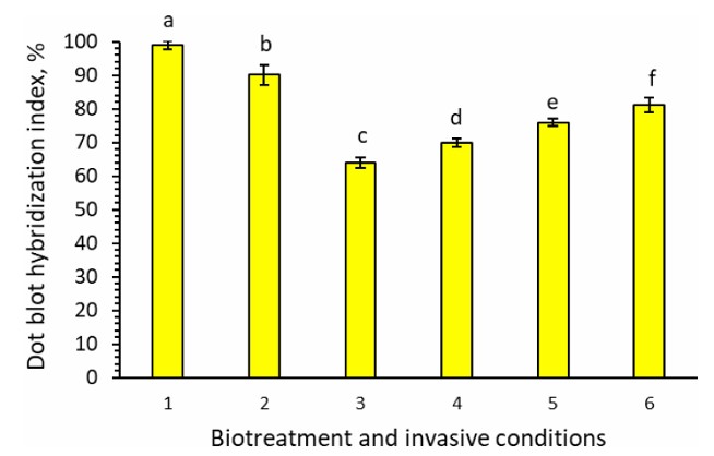 Index of dot blot hybridization between mRNA isolated from control tomato plants and 33Р-labelled si/miRNA isolated from tomato plants grown in vitro on the MST1 nutrient medium: 1. Untreated plants, invasive-free conditions (control); 2. Untreated plants, invasive conditions; 3. Invasive conditions, treatment with 10 µL/L of Averkom nova; 4. Invasive conditions, treatment with 25 µL/L of Averkom; 5. Invasive conditions, treatment with 100 µL/L of Phytovit; 6. Invasive conditions, treatment with 100 µL/L of Violar.