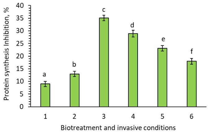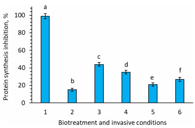 For si/miRNA isolated from experimental plants grown under invasive conditions without adding any bioproducts, the silencing activity on the mRNA template of nematode increased to 13% (Fig. 4). It was quantified as the percentage inhibition of protein synthesis and measured as cpm/1 μg of protein in a wheat germ cell-free protein synthesis system, expressed as counts per min/1 ug of protein.