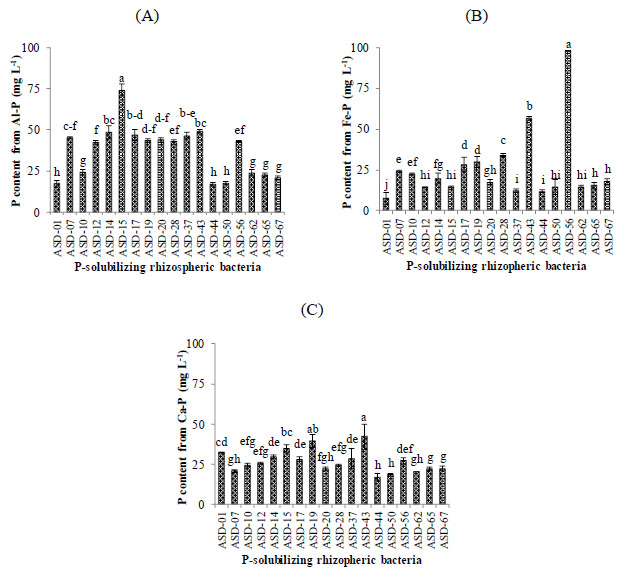 Ability of potent bacteria isolated from the rhizosphere of hybrid maize to solubilize (A) aluminum phosphate (AlPO4), (B) iron phosphate (FePO4), and (C) calcium phosphate (Ca3(PO4)2)