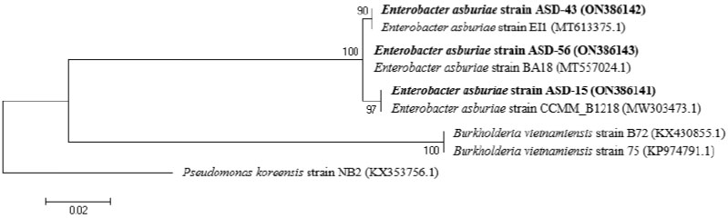 The potent PSRB strains of ASD-15, ASD-43, and ASD-56 were identified by the 16S rDNA gene sequences in a group within Enterobacter, where E. asburiae was the closest strain, with 100% sequence similarity for all three strains (accession numbers of ON386141, ON386142, and ON386143, respectively) (Fig. 2).